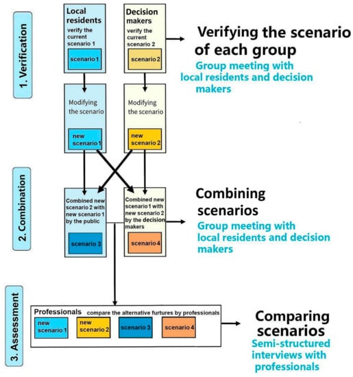 For step two, respondents were asked to discuss the differences that arose when combining the development preferences of both residents and decision-makers. We then modified and improved the new scenarios 1 and 2 to become scenarios 3 and 4 by combining these two different group opinions (Figure 2).