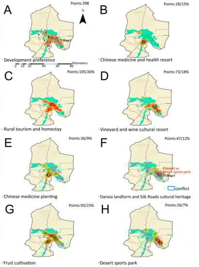 Kernel density heat maps of development preferences for local residents. (A) All kinds of development preferences; (B) Chinese medicine health resort; (C) Rural tourism; (D) Vineyard and wine cultural resort; (E) Chinese medicine planting; (F) Danxia landform and Silk Roads cultural tourism area (as the location of the planned desert sports park); (G) Fruit cultivation; and (H) Desert sports park. A higher density of points is visualized in dark purple, with lower densities in light purple.