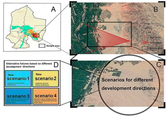 Within our assigned conflict area, we then made our detail bird’s eye view photo of the planned sample area for scenario planning in village1, following different development guidelines (Figure 4A–C). The local original landscape includes cultivated land along the river, artificial surfaces, and bare land with red Danxia landforms (Figure 4B,C). The guidelines for scenario planning included (1) Local resident development preferences: Danxia landform and Silk Roads cultural tourism areas, and (2) Decision-makers’ development preferences (the current plan): Desert sports park.