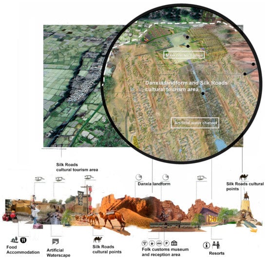 In our first scenario, we assume that the area has been developed based exclusively on the preferences of local residents, meaning it has become a tourist area focusing on the Danxia landform and Silk Roads cultural histories. The plan mainly consists of a large central plaza, a recreational and residential district built in the historical style, and a temple with adequate open space. The entrance plaza includes a folk customs museum, a sculpture of a local legend and hero, and other supporting amenities like parking areas. The folk recreational and residential district includes various recreational and reception facilities such as shopping streets, homestay venues, and distinctive small hotels, restaurants, and bars; the recreational and residential districts are separated by a landscaped artificial water channel. At this future moment, planning continues for a Loong Temple at the end of the channel, complete with open space for local market days and religious festivals. In this scenario, this cultural landscape corridor project provides cultural education, recreation and tourism functions relating to the Silk Roads culture, experiences, and folk customs, all with local Danxia landform scenery as the background.