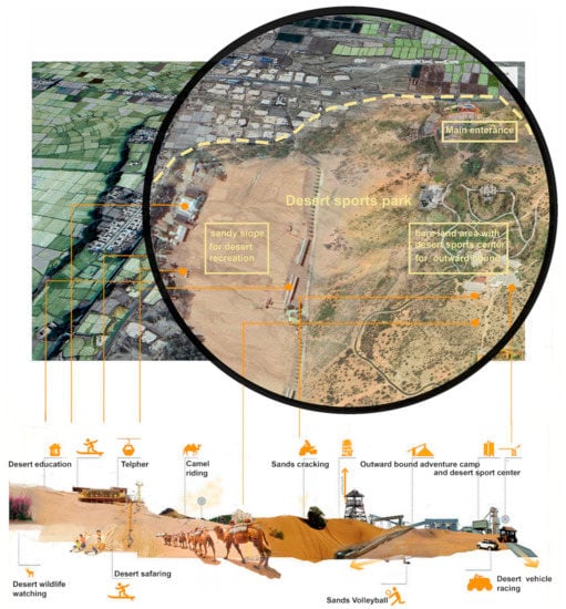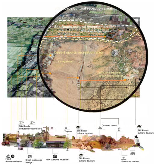 In the fourth scenario, we assume that identified conflict areas have been developed according to decision-makers’ development preferences paired with ideas from local residents. The area has therefore become a desert park with Silk Roads cultural reception areas near the main entrance. This scenario consists of a Silk Roads cultural reception area, an entrance plaza, a large-scale sandy slope area for desert recreation, a large-scale bare land area with an accompanying desert sports centre, an outward-bound camp, and a small garden to commemorate the ruins of a Silk Roads fire tower. The sandy slope and bare land areas provide similar functions as desert recreation amenities, as well as supporting facilities for desert hiking trails and outward-bound centres. The entrance plaza includes a folk customs museum and a main gate as historical features, while the reception area includes specialty restaurants and homestays that are located close to existing villages. In this scenario, this area acts as a functional source for cultural heritage conservation, cultural and folk experience-based tourism, desert recreation, sports training and recreation, and professional outward-bound activities.