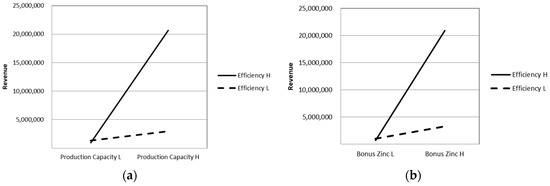 Figure 1 shows the relationship between revenue, efficiency, production capacity or Bonus Zn. In Figure 1a, the relationship between revenue, efficiency, and production capacity is shown. X- and Y-axes represent production capacity level and revenue, respectively, while two lines are classified based on the level of efficiency. As can be seen from the figure, the difference in revenue according to the production capacity is not large for the low efficiency group, but for the high efficiency group, the difference in revenue is large according to the production capacity. Therefore, the efficiency could be moderating the effect of firm’s production capacity on their revenue. In addition, when firms’ production capacities are low, there are a little difference in revenue between the high efficiency and low efficiency groups. That is, when the firm’s production capacity is low, the level of firm’s efficiency has no effect on their revenue. At the high production capacity level, however, the revenue of the firm with high efficiency is much higher than that of the firm with low efficiency. This result is consistent with the results of Wei et al. [36] who studied the effect of production capacity on the revenue of steel company.