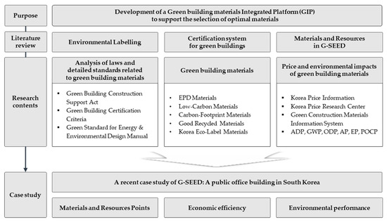 Therefore, this study aims to build a green building materials integrated platform (GIP) that will provide information about selected certification systems related to a wide range of eco-friendly materials in South Korea. Moreover, this GIP is intended to support the evaluation of materials and resources criteria in Green Standard for Energy and Environmental Design (G-SEED), through the development of a green building materials database that includes product prices. This GIP will enable construction-related entities to perform efficient comparisons and analyses of products during the design stage and contribute to optimized decision making through knowledge of product prices and environmental impacts. Figure 1 shows the complete flowchart of this study.