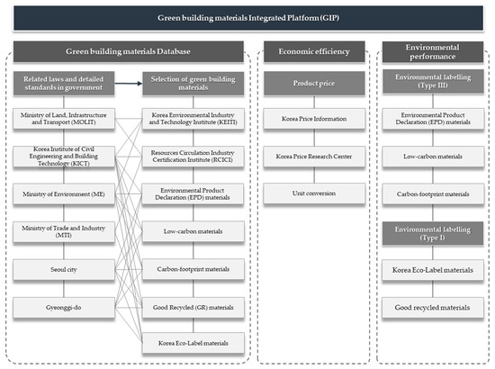 This study developed a green building materials integrated platform (GIP) to support the evaluation of materials and resources in the G-SEED green building certification system currently used in South Korea. GIP is based on green building materials which are configured by Type I and III environmental labeling materials. Green building materials are the detailed evaluation criteria and guidelines, construction cost criteria, and selection criteria for green building materials were selected from 16 laws and regulations compiled by eight institutions related to the materials and resources evaluation category in G-SEED. The GIP was developed by constructing a green building materials database that includes product prices and environmental impact data to enable construction-related entities such as architects to efficiently compare and analyze materials according to their environmental performance and economic efficiency. The following conclusions were reached.