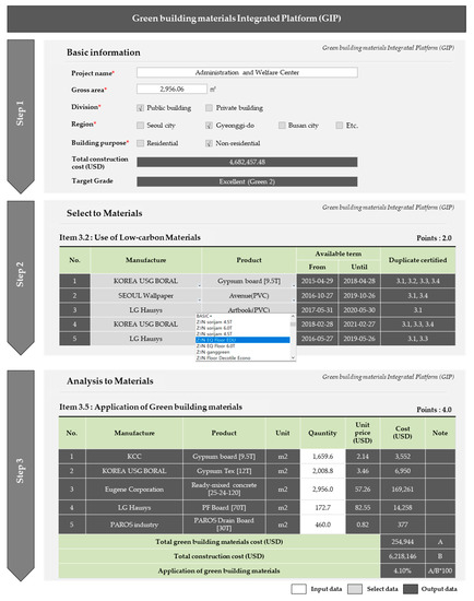 Based on the constructed green building materials database, an Excel-based GIP was developed to improve the accessibility and efficiency of construction-related entities. The GIP was composed of four steps: Input sheet, select sheet, analysis sheet, and database sheet.
