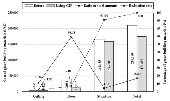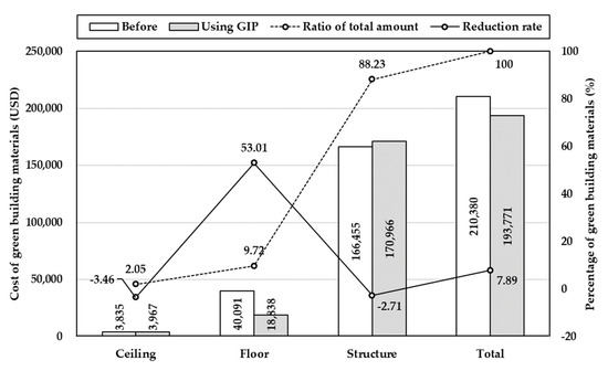 In Case 1, the cost was reduced by 16.87% (USD 35,483). The reduction rate was the highest for the floor materials, representing a saving of 69.43% (USD 27,833), followed by ceiling and structure materials. In Case 2, the cost was reduced by 7.89% (USD 16,609). The reduction rate was the highest for the floor materials, representing a saving of 53.01% (USD 21,253). However, structure and ceiling have rather increased costs, because Case 2 products are focused on eco-friendly. Specifically, ready-mixed-concrete accounted for approximately 90% of the cost of green building materials and corresponded to grade 3 and 2.4 points in item 3.5 for just the one product. This is because it is an important and costly structural component used in large quantities. Table 8, Figure 4, and Figure 5 show the results of the economic efficiency analysis of the alternative products proposed by the GIP.