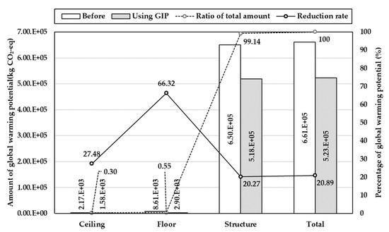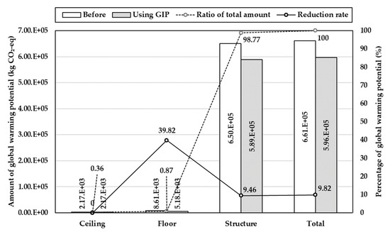 To analyze the environmental performance of the products, six IPCC-defined greenhouse gases emitted during material production were converted to GWP and evaluated. The total GWP in the target building was 6.61 × 105 (kg CO2). In Case 1, the GWP was reduced by 9.82% (6.49 × 104 kg CO2). The reduction rate was the highest in the floor materials, which was reduced by 39.82% (3.43 × 103 kg CO2), followed by structure and ceiling materials. In Case 2, the GWP was reduced by 20.89% (1.38 × 105 kg CO2). The reduction rate was the highest in the floor materials, which was reduced by 66.32% (5.71 × 103 kg CO2), followed by ceiling and structure materials. This is because the types of floor materials are diverse and the GWP emissions factor varies greatly depending on the material type and properties. Specifically, the ready-mixed-concrete was shown to be an important material from an environmental perspective because it accounted for approximately 99% of the total GWP. Again, this is because ready-mixed-concrete is a major structural member with a high GWP due to its large quantities. Table 9, Figure 6, and Figure 7 show the results of the environmental performance analysis of the alternative products proposed by the GIP.