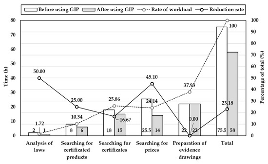 Two G-SEED case studies were performed using the developed GIP, both of which indicated that the economic efficiency and environmental performance of buildings could be improved by using alternative materials and resources proposed by the GIP. Case 1, which focused on economic efficiency, was more effective in terms of G-SEED and construction cost reduction. Case 2 was less effective in terms of construction cost but showed excellent improvements in both environmental performance and economic efficiency relative to the material combination selected in the existing building. The GIP developed in this study can be used to calculate various environmental load emissions and costs of green building materials for each part of a target building. Furthermore, construction-related entities, including architects, can directly participate in the selection of materials based on their environmental performance and economic efficiency. The case study results suggest that replacing concrete in the structure of the building, which has relatively high costs and GWP, is more efficient than changing the finishing material. Furthermore, because the work efficiency was difficult to quantify, a survey was conducted with construction-related entities engaged in actual G-SEED operations. For the target building, the work time spent for the evaluation of materials and resources was 75.5 h. The search for detailed product information—including laws, certified products, certificates, and prices—took 53.5 h, accounting for approximately 71% of the total work time. When GIP was used, the total work time was reduced to 58 h, improving the work efficiency by 23.18%. The search for detailed product information took 36 h, improving the work efficiency by 32.71%. In contrast, the preparation of evidence drawings, which differs for every project, did not show any efficiency improvement when using the GIP. Figure 8 shows the results of the survey on work efficiency using GIP completed by people in charge of G-SEED.
