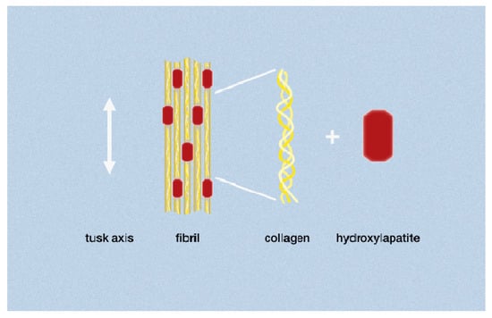 Natural ivory is a biocomposite material [11] with a complex hierarchical architecture. Its main component is dentin, a mineralized tissue consisting of mineral material embedded in an organic matrix of collagenous proteins and water [12,13]. The mineral portion is carbonate-enriched hydroxylapatite, which is characterized by the general formula Ca10((PO4)6(CO3))H2O with possible admixtures of further ions such as Mg2+ [14,15]. These rod-shaped apatite crystals (~20–100 nm in length) surround the fibril-forming collagen molecules (~300 nm in length), which are oriented along the length of the tusk (see Figure 1). The microscopic structure of ivory includes also a three-dimensional microtubule network within the ivory matrix [16,17]. The structure of ivory is therefore similar to the dentin of teeth and bones, including human ones [18,19,20,21,22].
