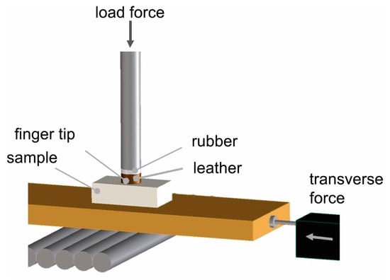 Schematic illustration of the grip test setup. For the various tests, the test finger was covered with several types of leather as specified (load: 0.5 kg). For measurement details, see text.