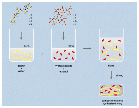 Schematic illustration of the synthesis of the gelatin–hydroxylapatite composite material. The synthesized ivory is formed from a slurry obtained by mixing the precursor solutions, followed by a drying process. The atomic structure of the two components are presented by segments of the collagen amino acid sequence (adapted from [35] and of the hydroxylapatite crystal structure (adapted from [31]).