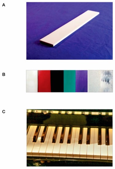 Samples of the composite material. (A) Machined plate (155 × 25 × 3 mm) of pure synthesized ivory as fabricated; (B) samples with colors and textures tuned by additives added into the slurry; (C) piano keys with veneers consisting of synthesized ivory (A), (C): Photos by H.-J. Mannhart).
