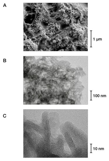 Microstructure of typical samples of synthesized ivory consisting of a gelatin–hydroxylapatite matrix. (A) Scanning electron microscopy image; (B,C) transmission electron microscopy images; (B,C) showing on two length scales the hydroxylapatite rods embedded in the gelatin matrix.