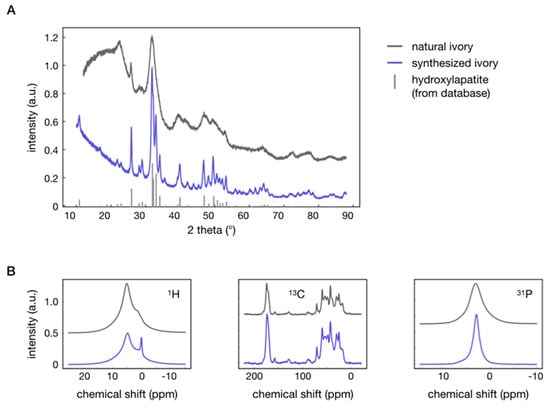 (A) X-ray powder diffraction patterns and (B) solid-state nuclear magnetic resonance (NMR) spectra of natural and synthesized ivory.
