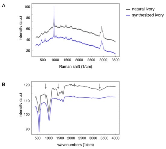 Solid-state nuclear magnetic resonance (NMR) provides additional information on the synthesized composite. Figure 6B compares the 1H, 13C, and 31P solid-state NMR spectra of the natural and synthesized materials (for more details, see Section 2.2). The spectra are virtually identical. The single exception is that the 1H signal at ~0 ppm is visible for the synthesized ivory but absent for natural ivory, which is caused by structural OH-groups of the hydroxylapatite. Whereas the peak is suppressed by carbonated apatite in this specific sample of natural ivory, it is exhibited clearly in numerous other ivory specimens [41]. The smaller peak width in the 31P spectrum is caused by the higher structural order of the hydroxylapatite in the synthesized material. The two materials are completely indistinguishable by Raman scattering spectroscopy (Figure 7A) and have almost identical IR spectra (Figure 7B). The higher water content of the natural ivory is expressed by the broad band between 3000 and 3500 cm−1 (arrow), which can arise from carbonated apatite in natural ivory. Carbonate groups in the apatite of natural ivory, which we did not strive to mimic, result in distinct bands at 871 and 1413/1446 cm−1 for natural ivory. The vibration frequencies of the IR and Raman bands of both compounds are listed in Table 3.