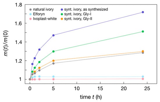 Comparison of the water absorption of natural ivory and of synthesized ivory with different surface treatments. The figure shows the water uptake of samples immersed in water at room temperature as function of time. For measurement details, see Materials and Methods.
