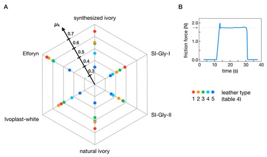 (A) Comparison of the lateral grip forces (kinetic friction μk) acting between artificial test fingers and samples of natural and synthesized ivory tuned by surface treatments as specified in the Materials and Methods Section. The test fingers are covered with several kinds of leather (cf. Table 4) and are pressed against the samples over a contact area of several mm2 with an approximate 5 N force. The coefficient of the kinetic friction μk is obtained from the plateau values of the friction force vs. time curve of (B). (B) Shows the friction force vs. time curve for SI-Gly-II sample with leather 5. For measurement details, see Section 2.2.