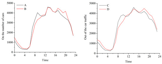 After analyzing the distribution characteristics of the floating car data recording the getting on and off time at different periods, it is ideal to divide the data into two groups for processing in accordance with working days and weekdays, and the hourly traffic volume of each traffic community is first counted. The traffic volume represents the traffic flow in the traffic community, while the amount of traffic represents the inflow [37]. The formula for establishing the net traffic in a traffic community is as shown in Equation (1)