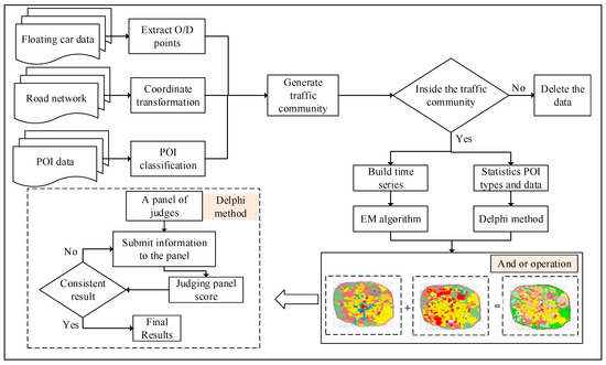 The technical flow chart is shown in Figure 3. In this paper, the first step is to use the high-level road network to generate traffic communities, and the traffic communities are used as the research units of this paper. The second step is to construct a time series based on a floating vehicle trajectory and to use cluster analysis on it with a maximum expectation algorithm for identifying urban functional regions [31]. In the third step, a method of semantic information mining based on POI data density and type using the Delphi method [32] is proposed. Finally, the final recognition result is obtained by using the two results.