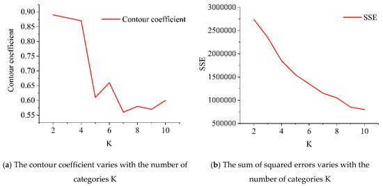 In this paper, the Expectation-Maximization algorithm (EM) is used to cluster time series. The EM algorithm starts from the initial value until convergence, and the EM algorithm is relatively scalable and efficient for processing large data sets. And it is more suitable for high dimensional data clustering. The EM algorithm first calculates the network traffic of each traffic community in the E step, and cluster traffic communities in accordance to the net traffic, and then performs the M step to assign the K value to a similar traffic community based on their attributes. The determination of the K value needs to consider the characteristics of the data set, the purpose of the classification, and the effectiveness of the final clustering effect. This paper mainly uses the contour coefficient Silhouette [41] and the error square sum (SSE) to select the optimal aggregation and the number of classes. Due to the concentrated sample data set, there are many regions with a net traffic value of zero. Therefore, we divide the regions with a residual flow of zero value into one class. The calculated clustering contour coefficient value and SSE value for other traffic communities is shown in Figure 5. As can be seen from the figure below, when the K value is equal to two values, the contour coefficient and the sum of error square begin to decrease. When K = 6, the inflection point appears. It is clear that the larger the contour coefficient and the smaller the squared error, the better the clustering effect. So in this paper, the number of clusters K is taken as a value of six.