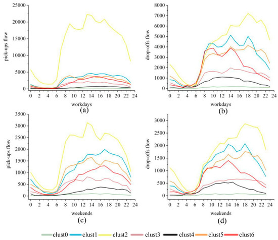 The comparison of pick-up and drop-offs flows within different clusters and at workdays and week days: the average pick-ups flows at workdays (a), the average drop-offs flows at workdays (b), the average pick-ups flows at weekends (c), and the average drop-offs flows at weekends (d).