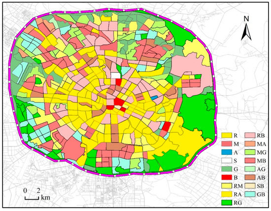 R is for residential land; M stands for industrial logistics land; A represents land for public service management and facilities; S is for transportation facilities; G is for green square; B stands for commercial office space; RM represents mixed land for residential life and industrial logistics; RA stands for mixed-use of residential and public service management and public service facilities; RG stands for residential and green square mix; RB stands for mixed residential and commercial land; MA stands for mixed-use of industrial logistics and public service management and public service facilities; MG represents the mixed land of industrial logistics and Greenland squares; MB represents a mix of industrial logistics and commercial office land; AG stands for public service management and mixed-use of public service facilities and green square; AB stands for public service management and mixed-use of public service facilities and commercial offices; SB stands for a mix of transportation and commercial and office space; GB stands for green squares and mixed commercial and office land.