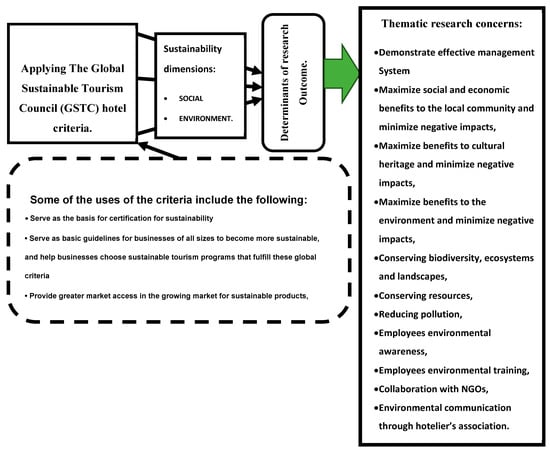 The Global Sustainable Tourism Council (GSTC) in alliance with International Social and Environmental Accreditation and Labeling Alliance (ISEAL) are organized around four themes for hotels’ sustainable practices: “effective sustainability planning, maximizing social and economic benefits for the local community, enhancing cultural heritage, and reducing negative impacts to the environment” [38] (p. 1). Similar to manufacturing firms, green adoption in hotels that provide services is increasingly accepted as indispensable to generating long-term profitable services that positively reflect on the firms’ environmental and social responsibilities [81]. Furthermore, Saura et al. [82] explored that hotels’ environmental practices should expand beyond the physical location of the hotel, rather they should extend to the surrounding environment “including the pure air in the facilities and surroundings, the absence of noise, and the abundance of nature and plants, in the hotel ecosystem” (p. 14). They asserted that travelers’ positive sentiments regarding these indicators should translate to the hotel managers’ commitment to respect the sustainability of natural areas, as well as the use of local products and experiences.