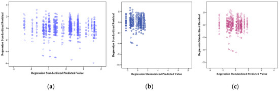 Cloud points of standardized predicted values vs. standardized residuals (a) Global model graph; (b) Lecture room model graph; (c) Practice room model graph.