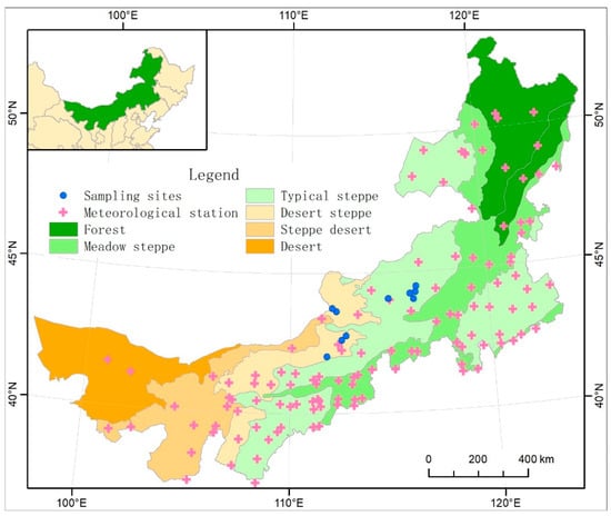 Distribution of field monitoring sampling sites and sampling sites selected for meteorological stations in the typical steppe and desert steppe areas in Inner Mongolia.