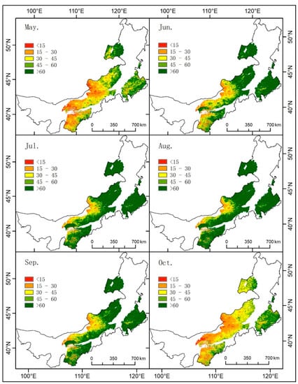 The monthly VI data were obtained by the maximum synthesis method, which calculates the average of the growing seasons (from May to October), based on the monthly VI, and finally converts these into 250 m × 250 m and 500 m × 500 m raster images. In areas with a low coverage of vegetation, the VI value could be greatly affected by soil spectral characteristics; in some areas where vegetation index pixels are filled with invalid values and noise, the noise mainly occurs in areas with basically no vegetation coverage, so only the areas with VI > 0.1 were considered [].