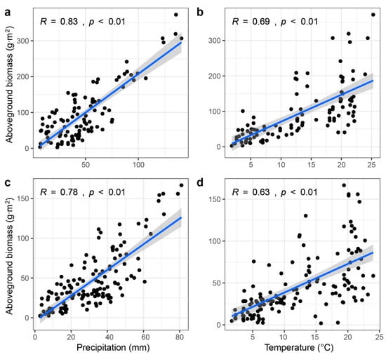 Climate is a key influential factor of grassland AGB [,,]. Precipitation is generally considered to be the main controlling factor affecting spatial changes of AGB in arid and semi-arid regions. There are many studies showing a positive linear relationship between grassland AGB and mean annual precipitation [,,,]. However, some researchers believe that the increase in temperature has a significant impact on the biomass of different steppe ecosystems []. It has also been reported that AGB is mainly related to the average temperature of the growing season []. Therefore, it is necessary to analyze the effects of temperature and precipitation changes on the AGB of different grassland ecosystems.
