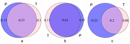 Contributions of precipitation and temperature in different steppe areas. (a) Combination of two type steppe areas, (b) typical steppe, (c) desert steppe; P—contribution of precipitation, T—contribution of temperature, the overlapping part represents the common contribution, while the non-overlapping part is the individual contribution.