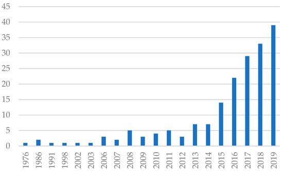 The first evidence we found in the literature concerning the possible re-use of SCG dates back to 1976, when Campbell et al. [14] presented their experiments on feeding steers and rats with rations in which coffee grounds replaced grain. From this moment to the 2000s, studies were rare and fluctuating, despite the introduction of terms like sustainability and sustainable development spreading from the 1970s and strongly affecting the direction of research of the following years, which may deal with a green valorization of coffee waste. It is then from 2015 that a significant increase of publications was observed, almost tripling in just four years, highlighting the relevance and the attention received by the topic, which is definitely expected to increase [15]. Figure 1 shows the trend in time of the number of publications.