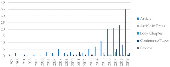 As can be seen from the above graph, most of the published works are journal articles; specifically, journals that turned out to be especially productive in numerical terms are Bioresource Technology and Journal of Cleaner Production, out of 115 journals recorded, overall. It is worth mentioning the seven literature reviews that were found, which were very helpful tools allowing one to identify scientific trends. For instance, by comparing the first literature review carried out in 2011 [2] and the last, published in the current year [15], both dealing with different utilization of SCGs, what emerges is that new methods for extracting oil from SCGs and producing biodiesel were developed, as well as the new biodiesel production bypassing the oil extraction or even the usage of SCGs for fighting cancer cells in the human body and other interesting and advanced issues not considered before, providing coffee waste as a raw material for other processes. The utility and diffusion that literature reviews provide are also demonstrated by the fact that results from the citation analysis on the sample of articles reveal that they are the most cited works, with an average of 10.7 citations per year, compared to an average of 3.8 citations for journal articles, 1.1 for conference papers, 1 for article in press, and 0.7 for book chapters. Again, concerning the quotation analysis, Table 1 shows the journal articles with an average value of more than 10 citations per year, and thus particularly relevant in this field.