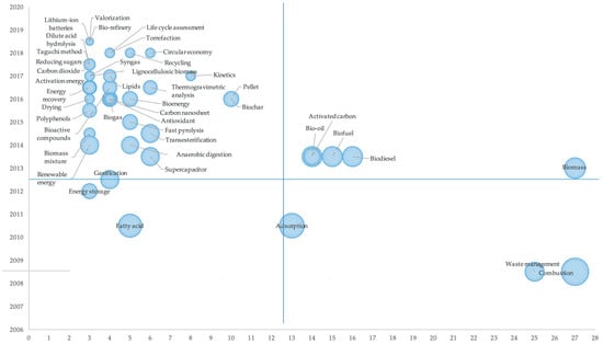 As far as the content analysis, due to the high number of studies returned by the two queries, we carried out an investigation on the main keywords found (considering the first nine keyword listed in each document). First of all, we removed 25 papers from this step that have no keywords (specifically, 15 journal papers, 8 conference papers, 1 review, and 1 book chapter); according to that, the number of papers considered here is 158. Manual adjustments were also made on the keywords, for instance on singular vs. plural words, acronyms, main synonymous terms, or uppercase vs. lowercase letters to ensure uniformity and rigor, as well as to avoid redundancies and repetitions. A total of 386 keywords was identified, 79% of which occurs just once. By excluding, for obvious reasons, the nouns “spent coffee ground”, “coffee ground”, and “coffee”, which could distort results as they were used to run the original queries, we identified the frequency for each keyword, i.e., the total number of times it occurs, and the persistency, i.e., the number of years of presence in literature, computed by considering the first and the last appearance, in order to evaluate trends, according to suggestions of Fadlalla and Amani [27]. The resulting graph (shown in Figure 3) is included, to make the graph more effective.