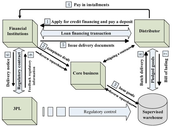 Confirming warehouse financing is one of the modes of operation in supply chain finance. Scholars have provided various views about the research on the operation mode of supply chain finance. For example, Albert (1945), Friedman (1942) [14], Raymand (1948), Dunham (1949) [15], and Burman (1966) [16] focused on the inventory pledge model and supply receivables in supply chain finance and investigated the account model in detail; in these works, the authors pointed out the business models, legal guarantees, and warehousing methods under two modes of operation and compared the differences between the two models, thus laying the foundation for the study on the two financial models. Guerrisi (2001) [17] explored the technology of capital transfer in supply chain finance from e-commerce and proposed a network-based electronic money transfer transaction method and applied it to the global trade supply chain [18,19]. Erik Hofmann (2009) [20] mainly viewed supply chain finance from the perspective of 3PL companies. The author also put forward that the quantity, value, and nature of an enterprise’s inventory and the service level of a logistics enterprise influence the income model of supply chain finance to a certain extent. Schafer and Henry (2014) [21] discussed the conflicts related to working capital among members of the supply chain on the basis of an idealized automotive supply chain network. Furthermore, Zhong and Sun et al. (2016) [22] proposed an inventory financing pricing model that maximizes the cash flow of 3PL enterprises when the default rate of SMEs is affected by pledge price.
