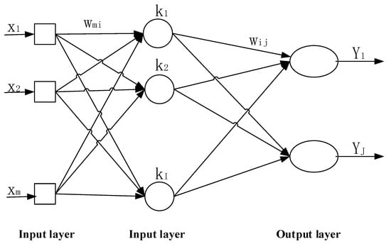 The figure displays a typical model structure of a three-layer BP neural network, where , I, and J represent the number of neurons in the input, hidden, and output layers, respectively. Other terms are defined as follows: