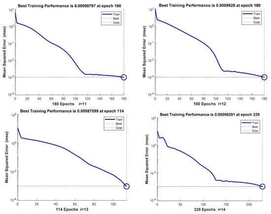 Moreover, we design a three-layer BP neural network with the tansig transfer function for the hidden layer, purelin for the output layer, and a hidden layer of neurons of 5~15. The training function selects the traingm function; the maximum number of trainings is set to 10,000, and network error is set to 0.001. At this point, only the error curves of the number of neurons in the hidden layer are selected as 11, 12, 13, and 14 for comparison.