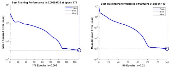 The network learning rate influences the stability and convergence of the BP neural network. To obtain a good network learning rate, we screen the MATLAB network learning rate, which has a default value of 0.01. Then, we select learning rates of 0.005 and 0.02 to train the model. The training functions of the hidden, input, and output layers select the traingdx, tansig, and purelin functions, respectively. In addition, the number of neurons of the hidden layer is set to 13 with a maximum number of training steps set to 2000 and expected network error value of 0.001. Figure 5 presents the training results.