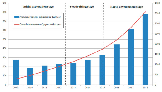 The growth regularity and trend of papers published in international high-level journals as well as conferences are important indicators of knowledge accumulation or change in research fields [26]. After screening the topic paper data of China’s AI international research, classifying and sorting them by year, the number and change trend of Chinese research papers on AI in 2009–2018 was obtained, as shown in Figure 1. Figure 1 has two coordinate systems. The left coordinate system corresponds to the blue column (number of papers published in that year), and the right coordinate system corresponds to the red curve (cumulative number of papers in that year).