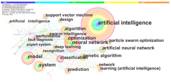 In this study, the topics and keywords in the literature were used to explore the hot topics and hotspots of Chinese scholars in the field of AI in 2009–2018. It is generally believed that keywords are highly condensed and concise in the topic and research hotspots; with the assistance of the knowledge map of co-occurrence keywords drawn by CiteSpace software, this study quickly elucidated the structure, network distribution, and frequency of co-occurrence of related articles keywords, so as to clarify the research hotspots in the field [73,74,75,76]. Through the visualization analysis of 3577 related papers collected in this paper, a knowledge map of the international research hotspots of China’s AI by node type and time-zone type was obtained. The two maps are shown in Figure 2 and Figure 3.