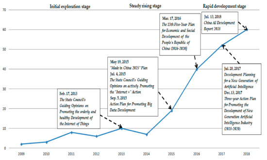 The trends and stages of China’s national-level AI policy (2009–2018). Source: According to References [19,51].