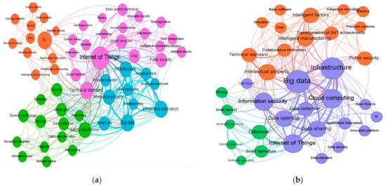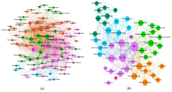 The rapid development keywords co-occurrence map of China’s national AI policy (2016–2018). (a) (2016–2017); (b) (2017–2018). Source: According to References [19,51].