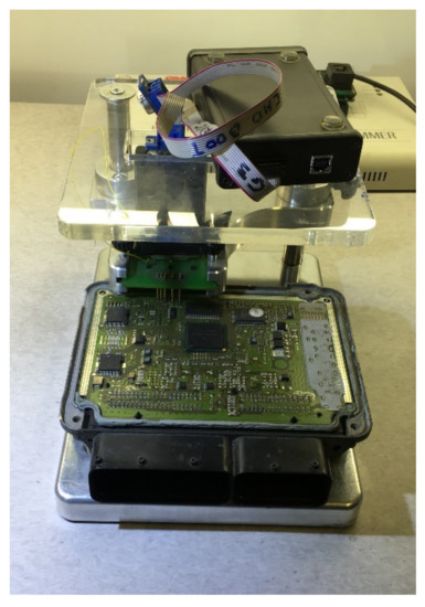 Changes also involved adjusting the engine electronic system, by modifying the internal combustion engine manufacturer’s computer software. The introduction of changes into the fuel injection controller was to determine whether and how the vehicle performance parameters change. Due to the specificity of the electronic system, it was necessary to disassemble the deck computer and introduce software changes on a special test stand (Figure 2). Prior to the introduction of changes in the computer software, a diagnostic measurement was performed to determine the possibilities and advisability of the engine parameter changes.