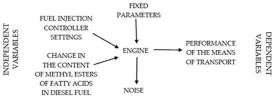 Eight performance parameters (tested parameters) characterizing transport internal combustion engines were tested, namely power, torque, sound emission generated by the internal combustion engine, content of PM in exhaust emissions, and the composition of exhaust gases (oxygen, carbon monoxide, carbon dioxide, nitrogen dioxides). Each of the eight performance parameters were tested for a configuration mixture-fuel injection setting (12 configurations). The experimental program was performed according to the scheme presented in Figure 4.