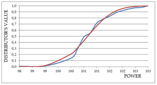 Firstly, the distributions of the internal combustion engine performance parameters were tested by application of consistency test of λ Kołmogorow. (Figure 6)The test was conducted for eight values of performance parameters of the tested transport means for a configuration mixture–fuel injection controller setting. The study includes a sample check of λ Kołmogorow consistency of power for the first setting of the fuel injection controller. An interval for which the population of measurements occurring in this interval was assigned for the analyzed parameter. To verify the hypothesis that the empirical distribution is equal to the theoretical distribution function (hypothetical), 150 measurements were tested. The results were used for the determination of the value of λ Kołmogorow statistics of the power test for setting I of the fuel injection controller. A value of p = 0.51 > 0.05 corresponds to the value of this statistics which was 0.82702. The obtained result proves that there are no grounds on which to reject the hypothesis of distribution normality.