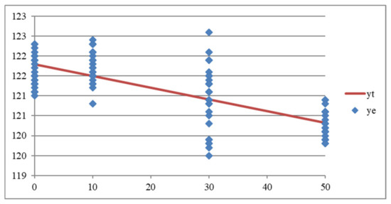 The values of estimators a and b were determined by the method of the smallest squares. Differences between the measurement values and their mean value as well as the values of defined functions were also calculated. Based on this, a regression line was defined to be: