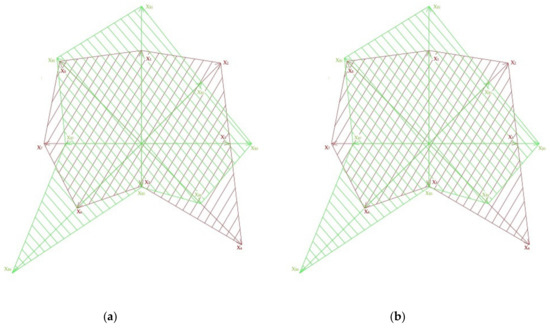 Graphic interpretation of vector components for: (a) mixture B30 and setting II; (b) mixture B50 and setting III.