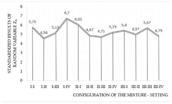 Weights (α) were determined by means of the AHP method (analytical hierarchy process) for the needs of each tested performance parameter. (Table 7) The values of weights for the performance parameters are presented in Figure 7. The determined weights were used to define the standardized results of random variable Zx, which has the following form: