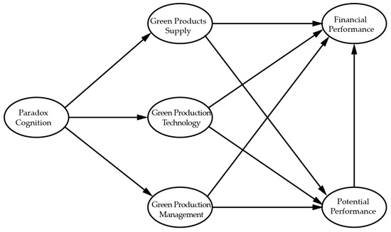 Potential performance refers to that which cannot be directly expressed in financial indicators, including the improvement of customer satisfaction, corporate image, and corporate core competence. Financial performance involves things that can be directly expressed by financial indicators. As a result, corporate performance (including both potential performance and financial performance) is hereby assumed to be positively affected by green industrial production in this paper. Based on the theory, the present paper, with green industrial production as the intermediary to construct a relationship model between paradox cognition, green industrial production, and corporate performance, as shown by Figure 1, focuses on three issues. First, whether paradox cognition is the premise and basis for enterprises to implement green industrial production, or if there is a significant and positive relationship between cognitive level and green industrial production. Second, whether the green industrial production of enterprises can improve enterprise performance. Third, if corporate performance is enhanced by green industrial production, whether green industrial production will directly impact on the financial performance or indirectly affect financial performance by affecting the potential performance of enterprises.